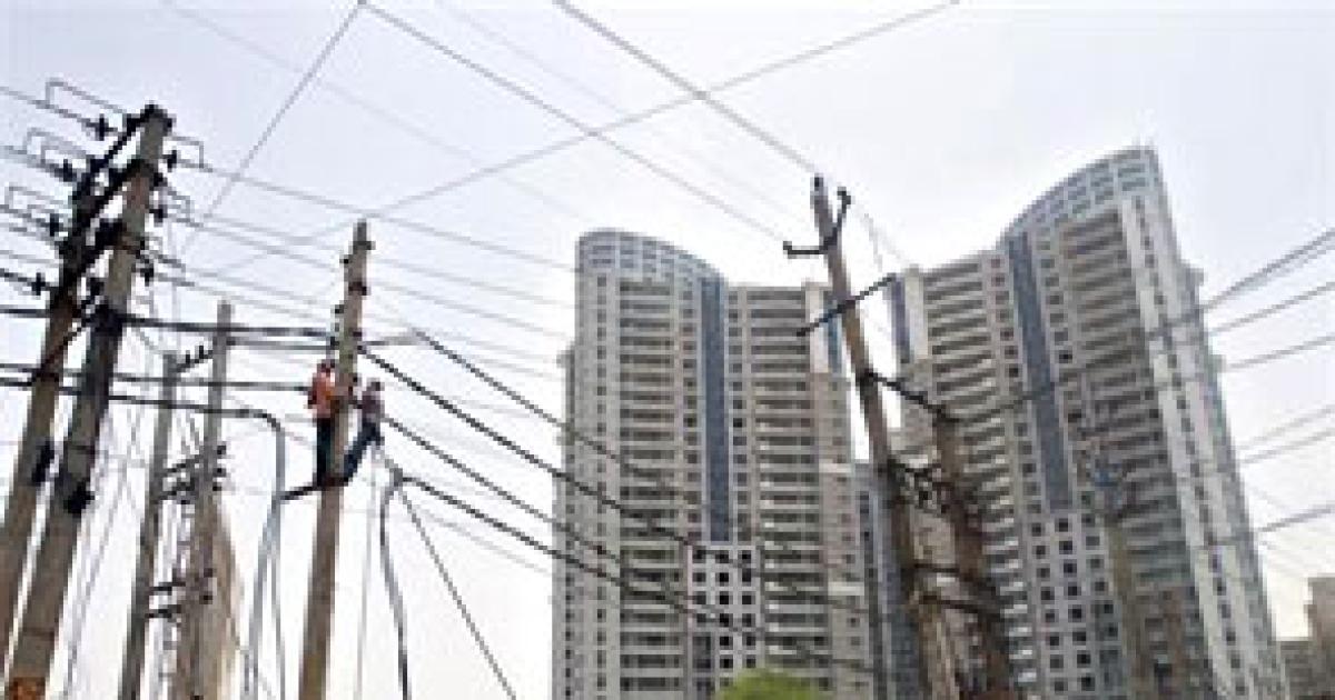 Image: Employees from the electricity board work on overhead cables installed in front of the residential apartments constructed by Indian property developer DLF at Gurgaon, on the outskirts of New Delhi. | Photograph: Parivartan Sharma/Files
