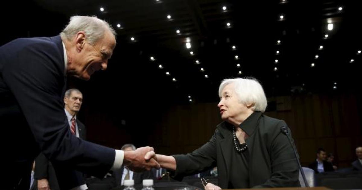 United States Federal Reserve Chair Janet Yellen (R) is welcomed by the chair of Joint Congressional Economic hearing, Senator Daniel Coats on 'The Economic Outlook' in Washington. Photograph: Gary Cameron/Reuters