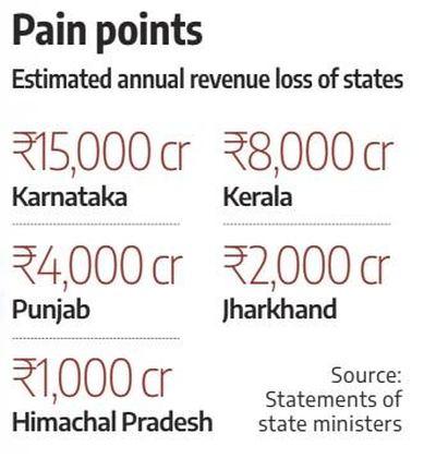 The Karnataka government estimates a revenue loss of Rs 15,000 crore annually and Punjab Finance Minister Harpal Singh Cheema has put the figure for his state at more than Rs 4,000 crore annually.