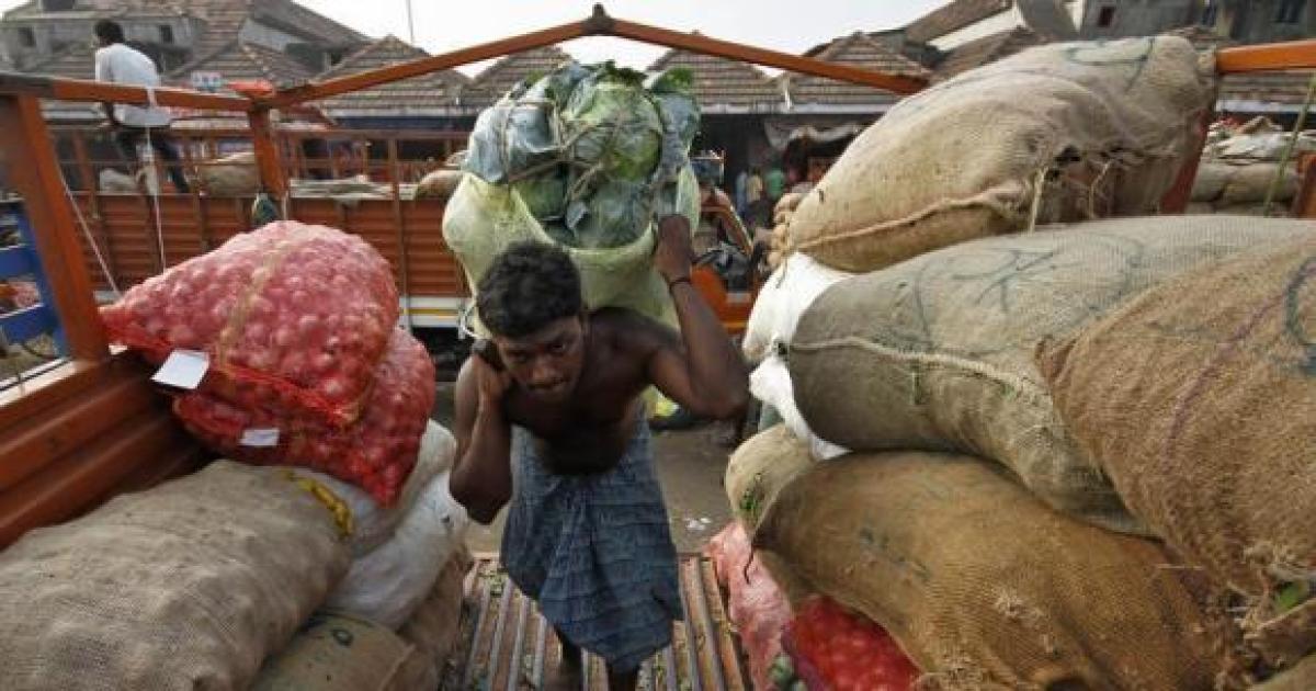 Image: A labourer carries a sack filled with cabbage to load it onto a supply van at a vegetable wholesale market in Chennai.