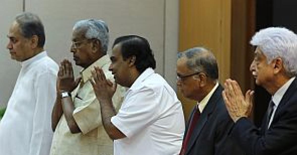 Image: Wipro Chairman Azim Premji (R), Infosys founder NR Narayana Murthy (2nd R), Mukesh Ambani (C), chairman of Reliance Industries Limited, an unidentified man and Rahul Bajaj (L), chairman of the Bajaj Group, greet India's Prime Minister Manmohan Singh (not seen) before their meeting in New Delhi.