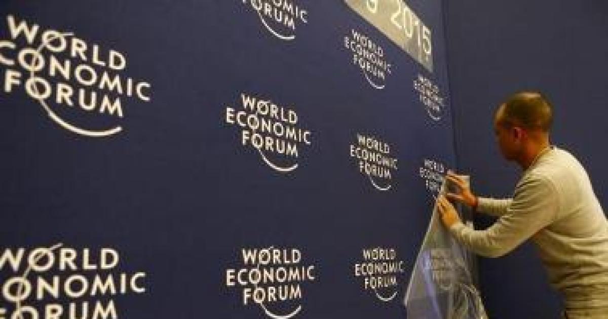 Image: A worker sets up logos of the World Economic Forum at the congress center in the Swiss mountain resort of Davos January 20, 2015. Photograph: Ruben Sprich/Reuters