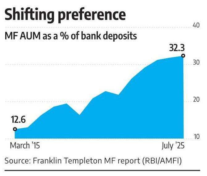 The MF AUM is now nearly one-third of the bank deposits. In July 2025, MFs had an AUM of Rs 75 trillion, equivalent to 32.3 per cent of the bank deposits at nearly Rs 232 trillion.