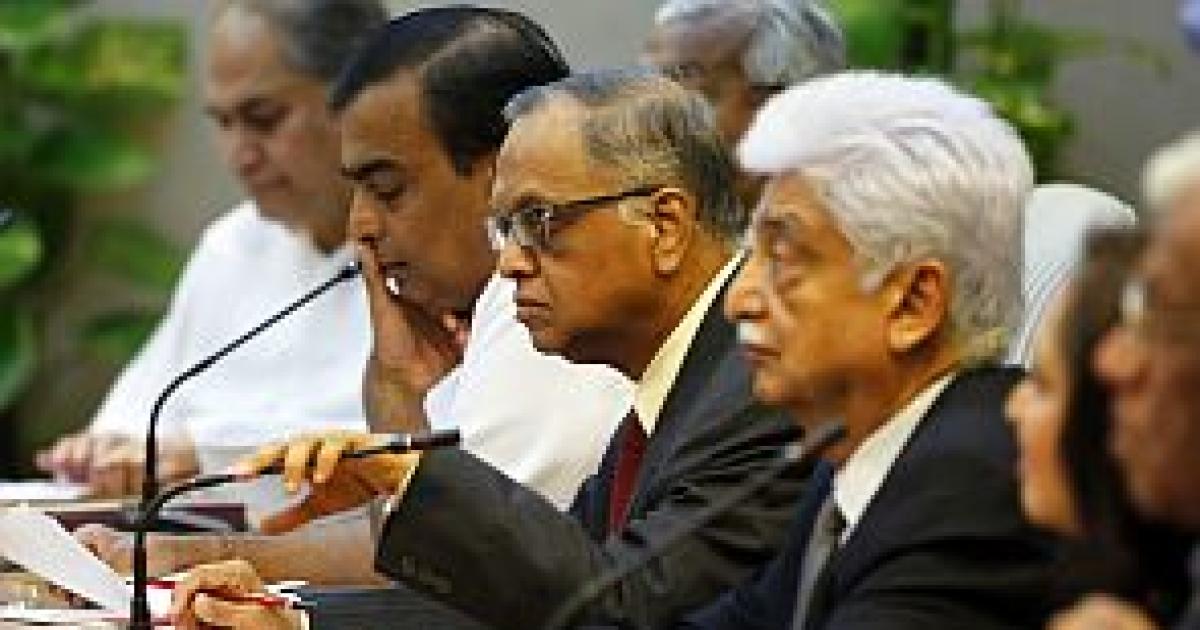 Image: Rahul Bajaj, chairman of the Bajaj Group, Mukesh Ambani, chairman of Reliance Industries Limited, Infosys founder NR Narayana Murthy and Wipro Chairman Azim Premji (L-R) attend a meeting with India's Prime Minister Manmohan Singh (not seen) in New Delh.