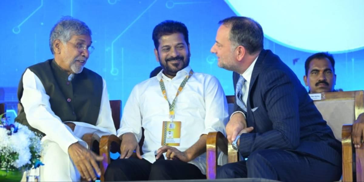 IMAGE: Nobel Laureate Kailash Satyarthi, left, Telangana Chief Minister Anumula Revanth Reddy and Eric Swider, director, Trump Media & Technology Group, at the Telangana Rising summit at Bharat Future City near Hyderabad. Photograph: Kind courtesy telanganacmo/Instagram