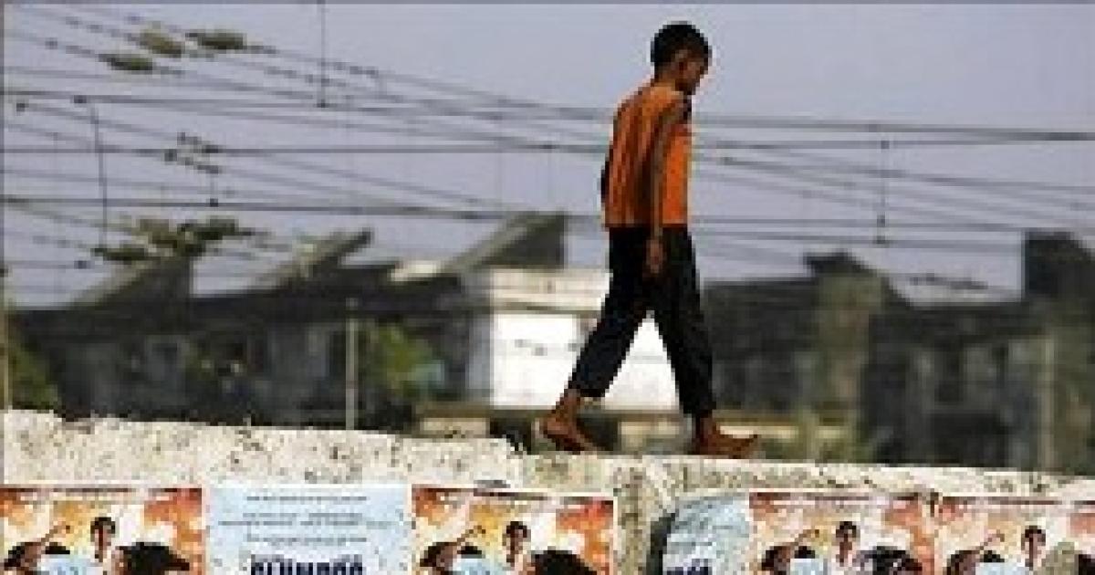 Image: A boy living on the street walks on a wall displaying publicity posters of Golden Globe award-winning film Photographs: Arko Datta/Reuters