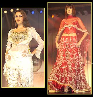 Some of the biggest names of Indian fashion were present at the awards including Tarun Tahiliani and Manish Malhotra. The fashion sequences were directed and choreographed by Elric and Zahira D'Souza with an array of Indian models including Yana Gupta, Fleur Xavier, Jessae Randhawa, Dipanita Sharma, Vidisha Pavate, Neha Dhupia, Cleo Isaacs, Zulfi Syed, John Abraham and Aryan Vaid walking the ramp. Seen here is the reigning Femina Miss India Neha Dhupia in a beige and gold ensemble and Fleur Xavier, resplendent in exquisitely embroidered red finery. Previous | Next