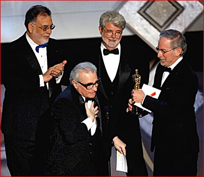 Clustered around Marty stood Hollywood's biggest directors, (left-right) Francis Ford Coppola, George Lucas and Steven Spielberg. Spielberg and Coppola spoke about how good it is to win the Best Director award, riffing on Lucas who had only managed 'a couple of nominations.'
