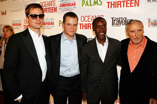 Three of Ocean's 13 -- Brad Pitt, Matt Damon, Don Cheadle -- pose with Dennis Hopper.