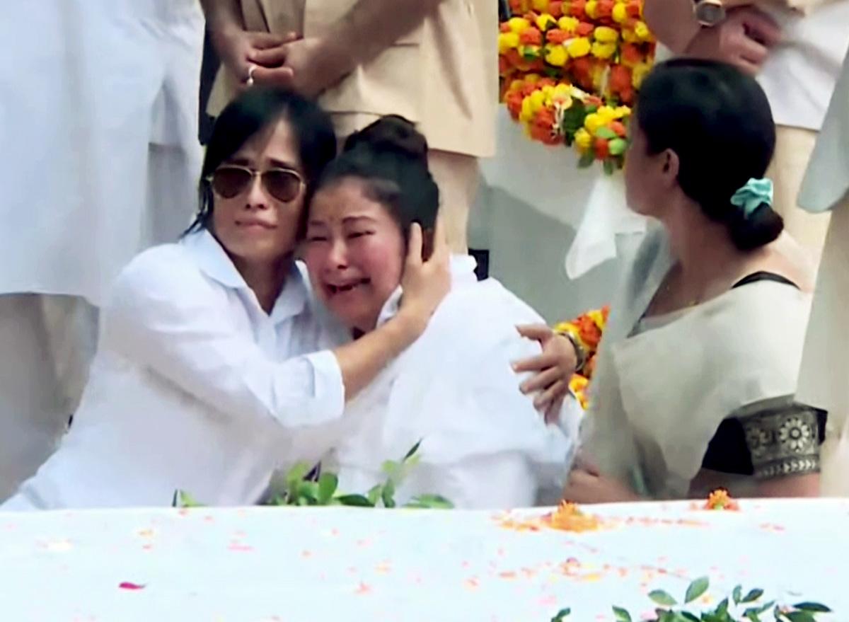 IMAGE: Garima Saikia Garg breaks down during the final rites in Kamrup on Tuesday. Photograph: ANI Photo