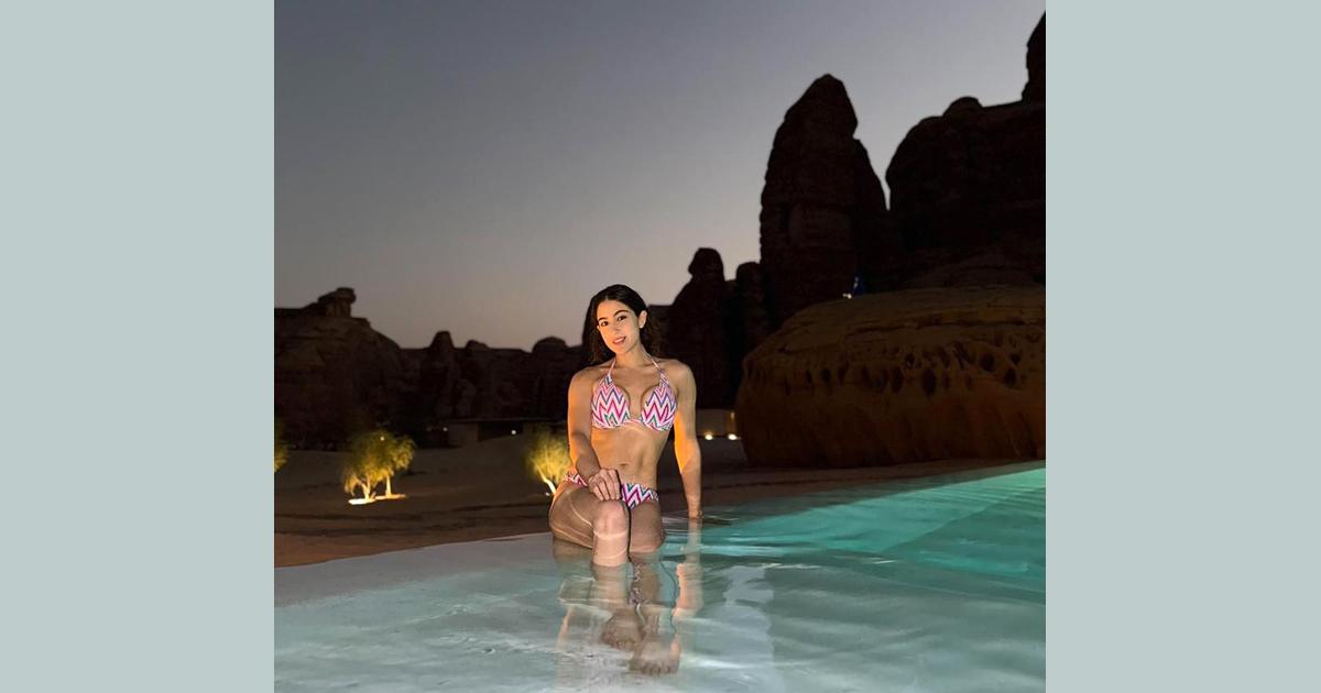 Sara Ali Khan glams up in a colourful two-piece bikini while holidaying in Saudi Arabia.