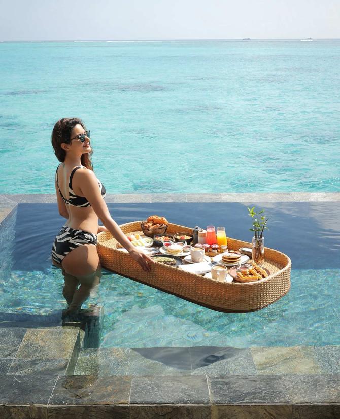 Amyra Dastur enjoys her floating breakfast in a black and white two-piece.