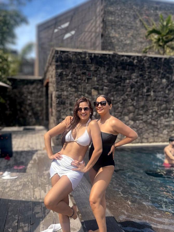 Her mum Shweta Tiwari also slays in her white bikini avatar as she celebrates her 45th birthday in style.