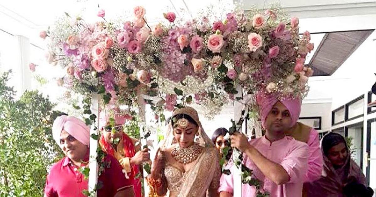 Amrita arrives for her Anand Karaj (Sikh marriage ceremony) under a canopy of flowers.
