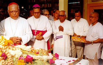 A Gandhian Bids Farewell Cardinals Simon Pimenta and Ivan Dias pay their homage to the little Gandhian, one of Bombay's bestknown figures. Also in the picture: Bharatiya Vidya Bhavan secretary S Ramakrishnan and former MP Murli Deora. Photographs: Jewella C Miranda BACK NEXT |