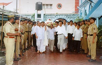 A Gandhian Bids Farewell Murli Deora and the city's Gandhians lead Ushaben's cortege to the Chandanwadi crematorium in Bombay. Maharashtra gave her a state funeral. Photographs: Jewella C Miranda BACK NEXT |