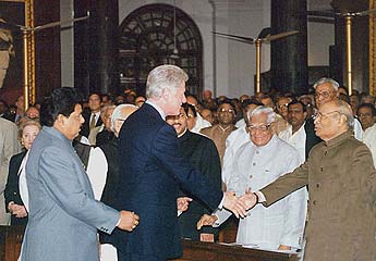 Clinton being introduced to former prime minister P V Narasimha Rao inside Parliament. Former President Ramaswamy Venkataraman is seen to Rao's right.