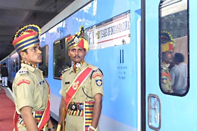 Steaming Ahead on NostalgiaLiveried personnel stand guard outside the air-conditioned compartments that were attached to the commemorative train for VVIPs who wanted to be part of the historic re-run but didn't want to sweat it out in the sultry Mumbai summer. |