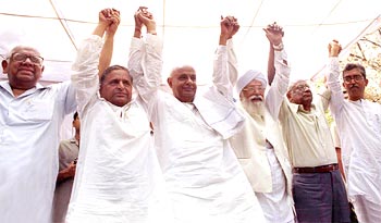 The CPI-M's Somnath Chatterjee; Samajwadi Party's Mulayam Singh Yadav; former prime minister H D Deve Gowda of the Janata Dal, Harkishen Singh Surjeet, also of the CPI-M, and A B Bardhan of the CPI join hands in New Delhi on Wednesday, April 17, to demand the resignation of Gujarat Chief Minister Narendra Modi over the communal violence in the state.