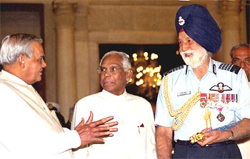 Marshal of the Indian Air Force Arjan Singh with President K R Narayanan and Prime Minister Atal Bihari Vajpayee after receiving his official baton at Rashtrapati Bhawan in New Delhi on Tuesday, April 23.