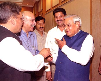 Prime Minister Atal Bihari Vajpayee shares a light moment with (from left) editors Dileep Padgaonkar and M J Akbar after he was presented with a copy of Akbar's new book, The Shade of Swords, in New Delhi on Thursday.