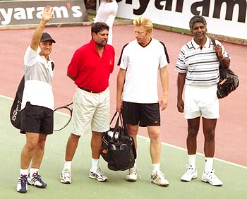 Actor Aamir Khan, former Indian cricket captain Kapil Dev and tennis stars Boris Becker and Vijay Amritraj got together for a charity tennis match in New Delhi, on Tuesday July 30.