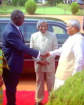 President A P J Abdul Kalam (centre) looks on as Ghana President John Agyekum Kufuor greets Prime Minister Atal Bihari Vajpayee in the forecourt of Rashtrapati Bhawan in New Delhi on Monday, August 5.