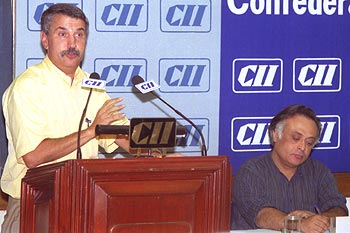'New York Times' columnist Thomas Friedman speaks on 'Globalisation Today & How India Fits In' at the CII headquarters in New Delhi on Wednesday, August 7. To his left is Congress leader Jairam Ramesh.