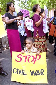 This young man may not yet know what it is all about, but nevertheless joins the other Burmese in New Delhi at a demonstration, on Thursday, August 08, to mark the 14th anniversary of the people's uprising in Myanmar.