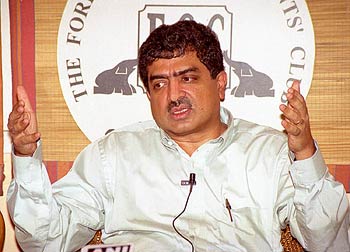 The CEO and Managing Director of Infosys Technologies Ltd, Nandan Nilekani, waxes eloquent on information technology at the Foreign Correspondents' Club in New Delhi on Tuesday, August 13.