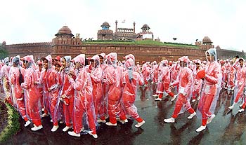 Schoolchildren brave the rain for the dress rehearsal of the Independence Day celebration at the Red Fort in New Delhi on Tuesday.