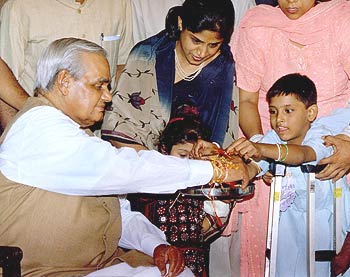 Prime Minister Atal Bihari Vajpayee gets a rakhi from a physically impaired child at his residence in New Delhi on the occasion of Raksha Bandhan on Thursday, August 22.