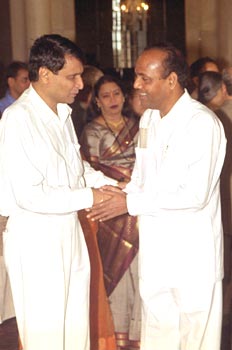 Former power minister Suresh Prabhu (left) congratulates successor Anant Geete who was promoted in the latest reshuffle in New Delhi on Monday, August 26.