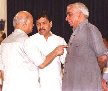 National Security Adviser Brajesh Mishra makes a point while talking to Finance Minister Jaswant Singh and Communications Minister Pramod Mahajan in the Ashoka Hall of Rashtrapati Bhawan in New Delhi on Monday, August 28.
