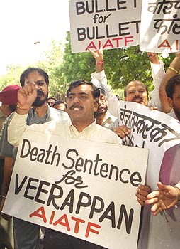 Activists of the All India Anti-Terrorist Front demonstrate in New Delhi on Wednesday, August 28, demanding death sentence for forest brigand Veerappan, who recently abducted former Karnataka minister H Nagappa.