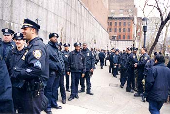 New York policemen gather outside The Waldorf Astoria, where the World Economic Forum kicked off amidst unprecedented security on January 31. More than 2,700 participants, including heads of government and leaders in various other fields, are participating in the conference, which examines the state of global capitalism.