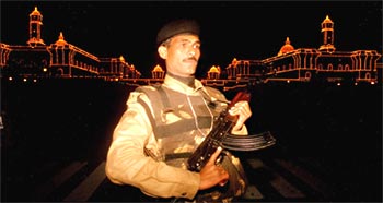 A commando stands guard at the rehearsal for the Beating the Retreat ceremony at New Delhi's Vijay Chowk on January 28. North Block and South Block, which house the ministries of defence, finance, external affairs and home, besides the prime minister's office, were specially illuminated for the occasion.