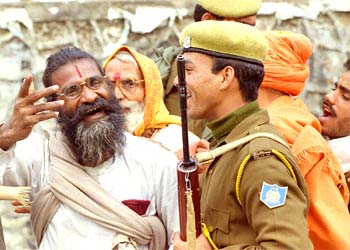 A policeman shares a joke with a sadhu at the Vishwa Hindu Parishad's Rally in New Delhi on Sunday, January 27. The rally was organised to press for construction of a Ram temple at the disputed site in Ayodhya.