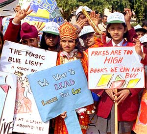 Children from different schools of Delhi demonstrate on Monday, January 28, outside the venue of the 15th World Book Fair. They were protesting against the high prices of books.