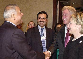 Finance Minister Yashwant Sinha greets former US president Bill Clinton and his wife Senator Hillary Rodham Clinton at a reception hosted by the Confederation of Indian Industry for delegates of the World Economic Forum on February 5 in New York.