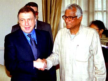 Defence Minister George Fernandes with Deputy Prime Minister Ilya Klebanov of Russia in New Delhi on February 6. The two countries are now planning to jointly produce armaments and military aircraft.