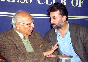 Tehelka.com CEO Tarun J Tejpal (right) confers with advocate Ram Jethmalani during a press conference in New Delhi on February 5. They accused the government of hounding Shankar Sharma of First Global, an investor in tehelka.com