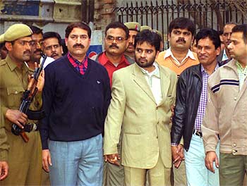 Aftab Ansari (in cream suit with beard), main accused in the attack on the Kolkata USIS, being taken to the Patiala House court in New Delhi on Sunday, February 10.