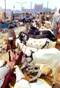 Goats on sale in front of Delhi's Jama masjid, for sacrificing on the occasion of Bakri-Eid, which falls on February 23.