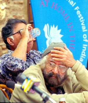 Bengali writer Sunil Gangopadhyay imbibes a glass of water as Khushwant Singh imbibes a speech at the international festival of Indian literature, 'At Home in the World', at the Neemrana Fort, Alwar, Rajasthan, on Thursday. Photographs: Sondeep Shankar/Saab Press |