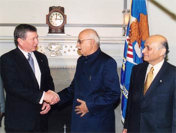 Home Minister L K Advani greets US Attorney General John Ashcroft as Indian Ambassador to the US Lalit Mansingh looks on in Washington. The first Indian home minister to visit the US, Advani was given full secret service protection, which is normally reserved for heads of state.