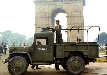 A jawan keeps vigil at India Gate in New Delhi on the occasion of Army Day, which was celebrated in a subdued manner owing to the deployment of forces on the border on January 15.