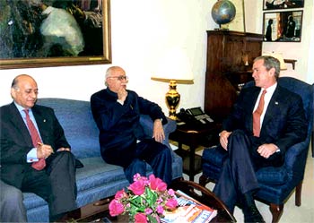 US President George W Bush 'dropped in' for a chat with Advani during the minister's meeting with Rice, and assured him that the pressure on Musharraf would not ease until he abandoned "terror as an instrument of state policy." Ambassador Lalit Mansingh took notes. Advani later expressed his satisfaction with Bush's pledge.