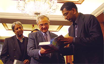 Penguin Books CEO David Davidar autographs a copy of his newly released book House of Blue Mangoes for Pakistan High Commissioner Ashraf Jahangir Qazi at the Taj Mahal Hotel in New Delhi on January 14.