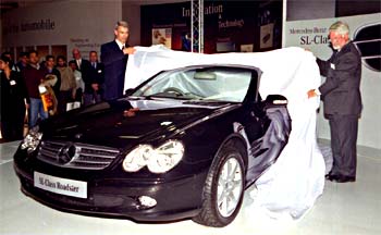 Juergen Ziegler, MD and CEO of Daimler Chrysler (on the left hand side of the car), takes the cover off the SL class Mercedes-Benz, on January 14.